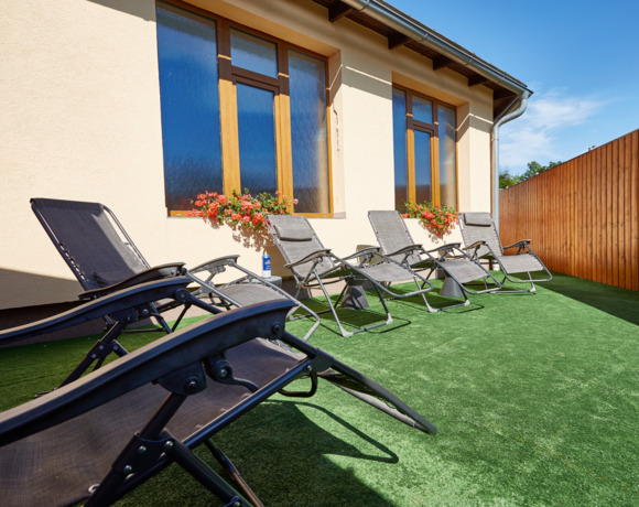 - terasa s lehátky (v letním období sluneční terasa na opalování, v zimním období pak ochlazovací terasa k sauně).
